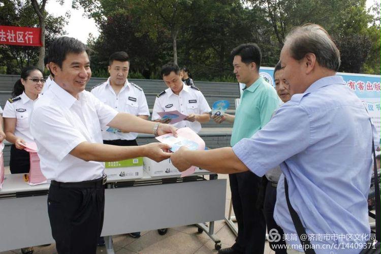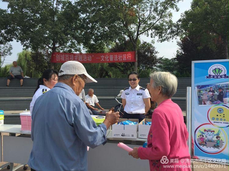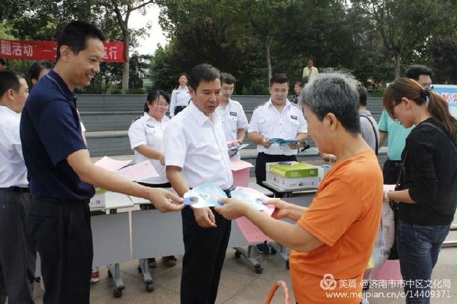 9月1日,济南市文广新局、市文化执法局与市中区文化局在王官庄大众广场联合开展"文化法制宣传进社区活动"。市文广新局刘建峰副处长、文化执法局张忠副支队长和市中区文化局副局长李兴安等领导,市中区文化市场综合行政执法大队人员等参加活动。活动现场采取发放宣传彩页、纳凉扇,摆放普法宣传展板,悬挂宣传横幅,设置普法咨询台等形式开展普法宣传活动。活动现场,社区居民踊跃参与,在宣传展板前仔细阅读普法知识,并纷纷表示:此次活动宣传内容贴切生活实际,特别是"网瘾"、"盗版书籍辨别"等方面的宣传内容,对家长进行家庭教育以及提高自我法律意识有很高的教育意义,受益匪浅。学法辩是非,知法明荣辱,用法处纷争,此次文化普法社区行活动,进一步加深人民群众对相关政策法规的认识,使普法理念深入人心,并对全市正在进行的"创城工作"加深了解,从而提高社区居民法律素质为创城攻坚战夯实基础。